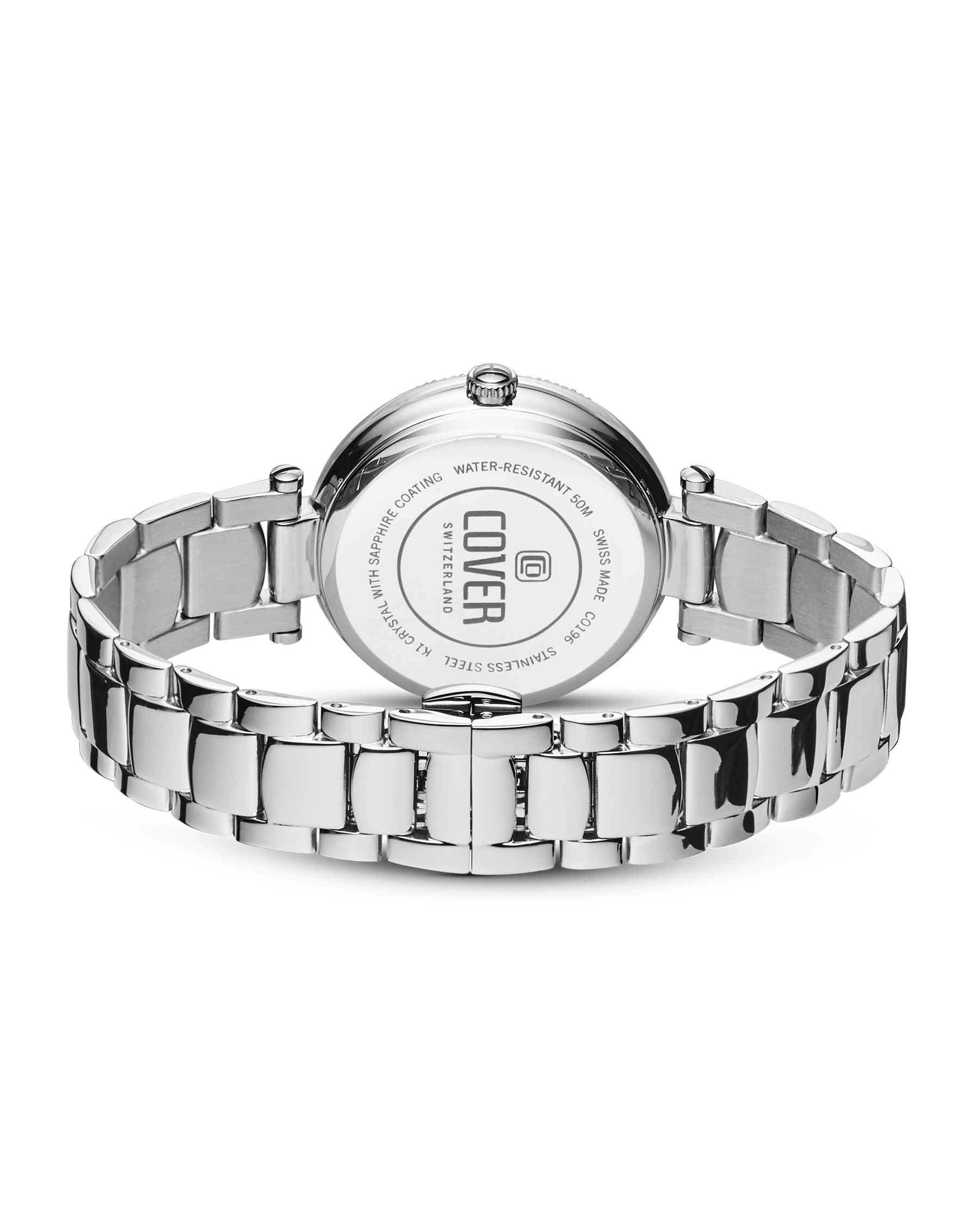 Our Swiss Made COVER Fly Me To The Moon Watch for women epitomizes celestial elegance with its silver stainless steel case and bracelet. This exquisite swiss women's moon phase watch features a fluted slim bezel and a silver mother-of-pearl dial adorned with radiant crystals as hour indices, capturing the essence of timeless beauty and sophistication. The dial is protected by a scratch-resistant sapphire crystal, ensuring lasting clarity and durability.