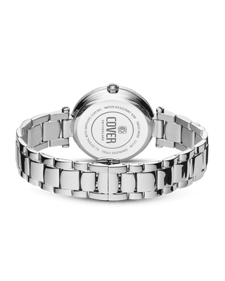 Our Swiss Made COVER Fly Me To The Moon Watch for women epitomizes celestial elegance with its silver stainless steel case and bracelet. This exquisite swiss women's moon phase watch features a fluted slim bezel and a silver mother-of-pearl dial adorned with radiant crystals as hour indices, capturing the essence of timeless beauty and sophistication. The dial is protected by a scratch-resistant sapphire crystal, ensuring lasting clarity and durability.