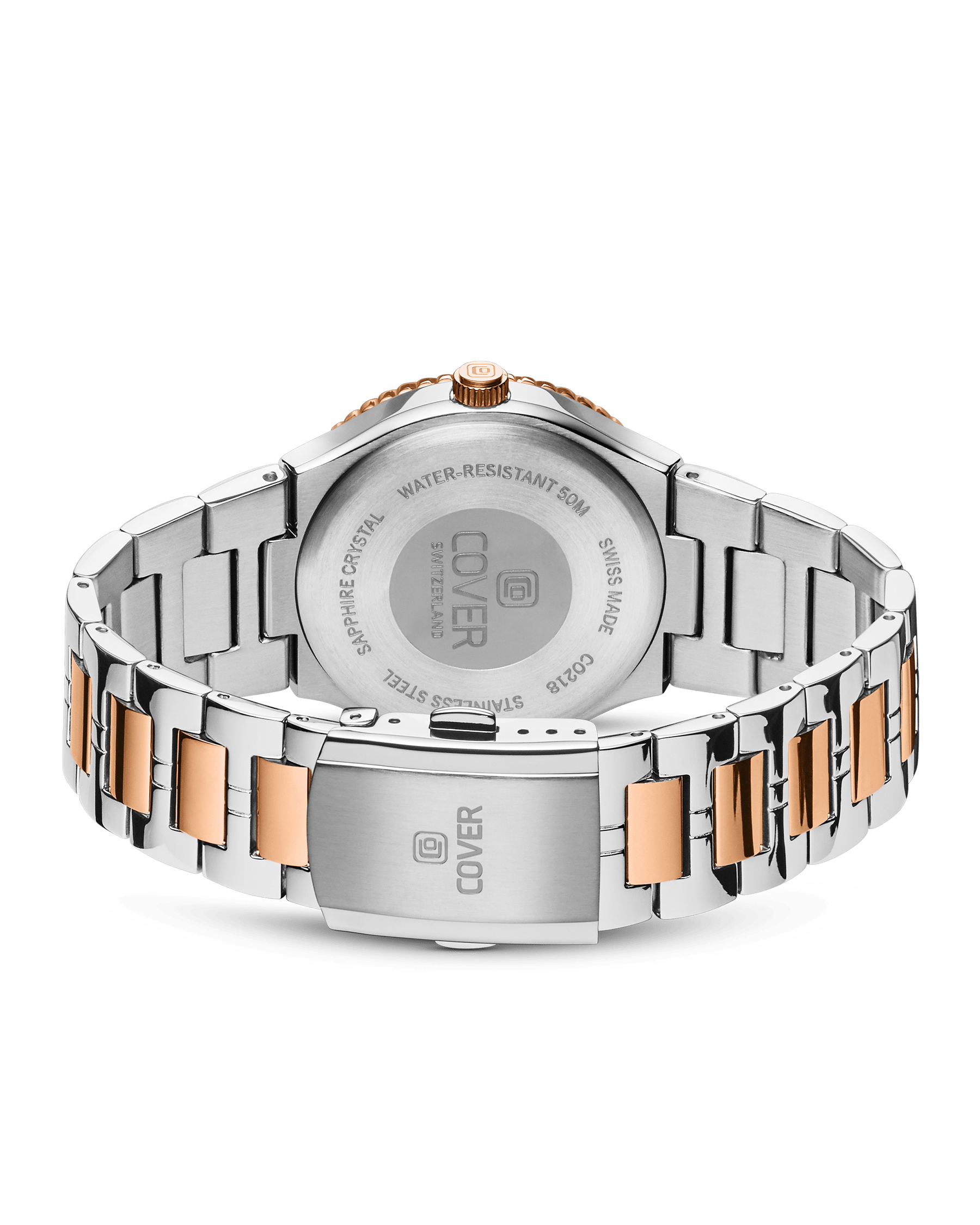 Experience elegance with the COVER Swiss Made Jumeira Watch for women, featuring a stylish two-tone stainless steel and rose gold case. The pristine white mother-of-pearl dial, adorned with sparkling crystals, is protected by scratch-resistant sapphire glass. This refined timepiece combines classic design with the reliability of a Swiss three-hand quartz movement.