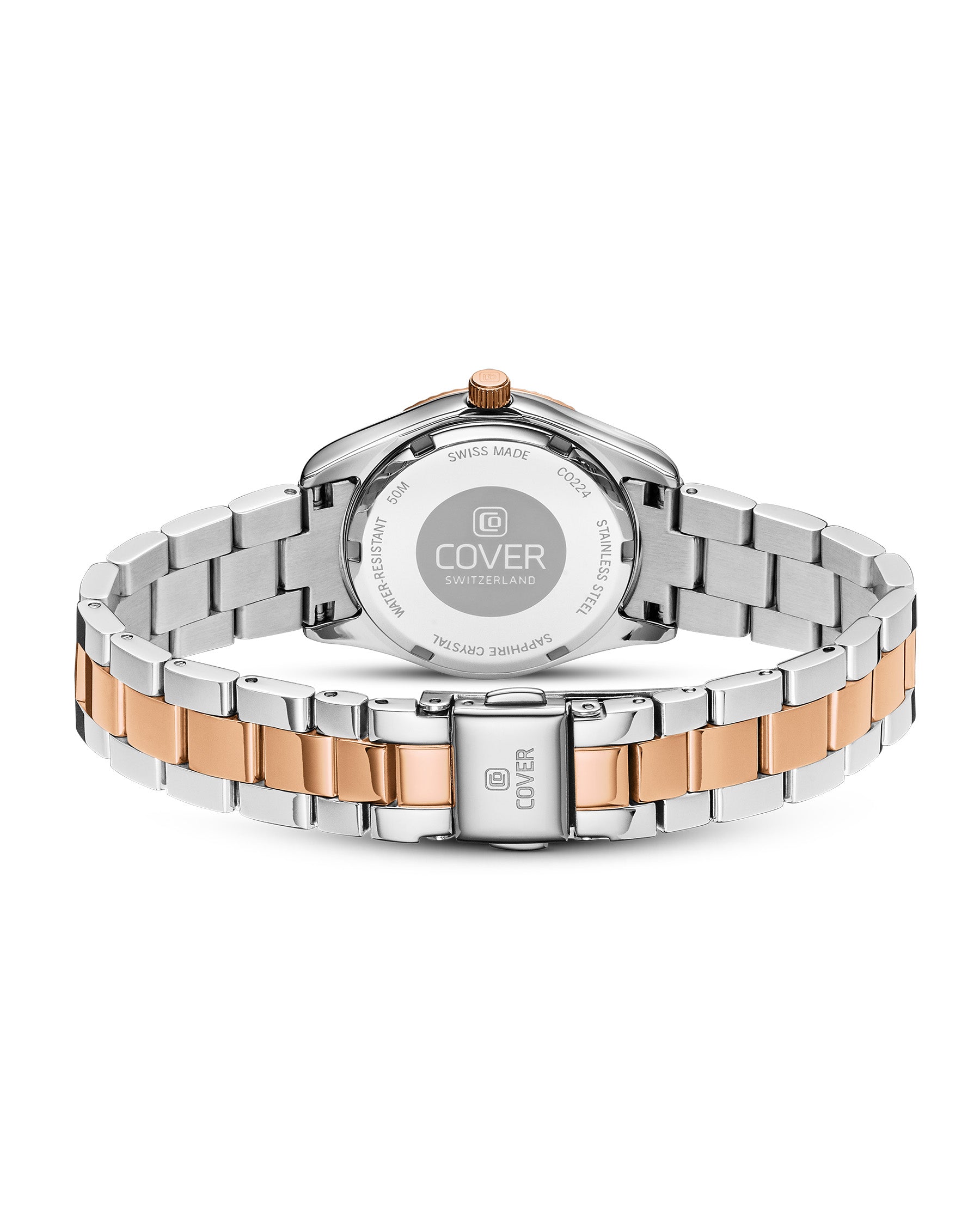 The COVER Valentina Mini White Pearl seamlessly blends modern design with timeless elegance. Its two-tone stainless steel case in rose gold and silver pairs beautifully with the luminous white mother-of-pearl dial. The rose gold fluted bezel and crystal hour markers add a touch of glamour to this sophisticated timepiece.